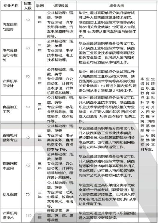 学校与西安市东城一中积极合作成立普职“名校+”,西安市东城一中成立专班进行授课与管理,稳固提升了学生的综合素质。近年来,通过职教单招考试、高职分类考试等多种途径,千余名学生先后被陕西科技大学、陕西学前师范学院、西安工业大学、西安石油大学、陕西工业职业技术学院、杨凌职业技术学院等高校录取。学校还与陕西交通职业技术学院、陕西职业技术学院、西安职业技术学院等高职院校开展合作办学,实现了中高职贯通,为学生奠定了成才之路。