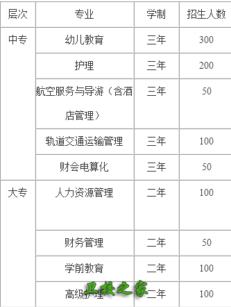 中专招生专业:学制均为三年,限招女生,要求身高153cm以上,护理专业155cm以上,轨道交通运输管理、航空服务要求160cm以上,五官端正,需面试。