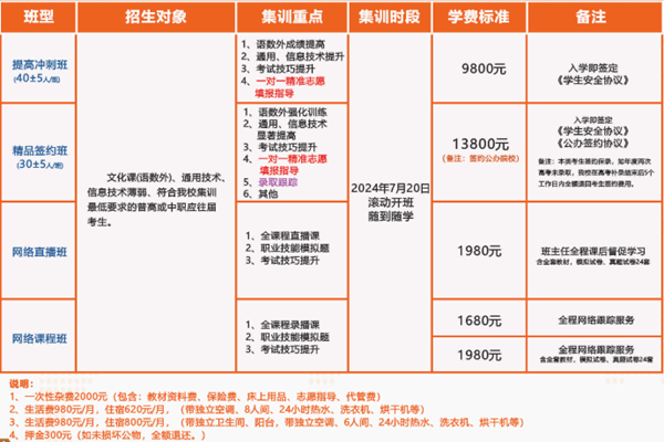 招生对象:文化课(语数外)、通用技术、信息技术薄弱、符合我校集训最低要求的普高或中职应往届考生。